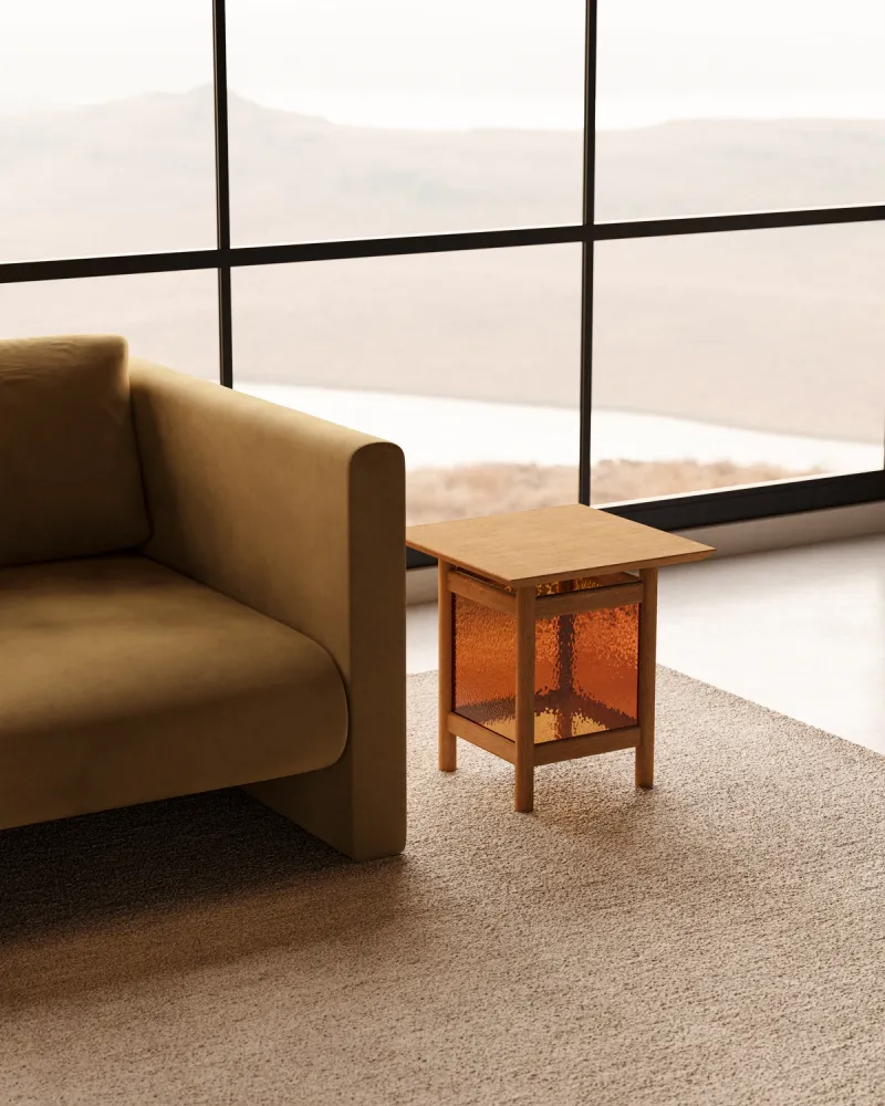 Ember side table explores how the combination of glass and wood gives the table a more sculptural presence, bringing a more dynamic quality to the space and shifting with the light throughout the day.